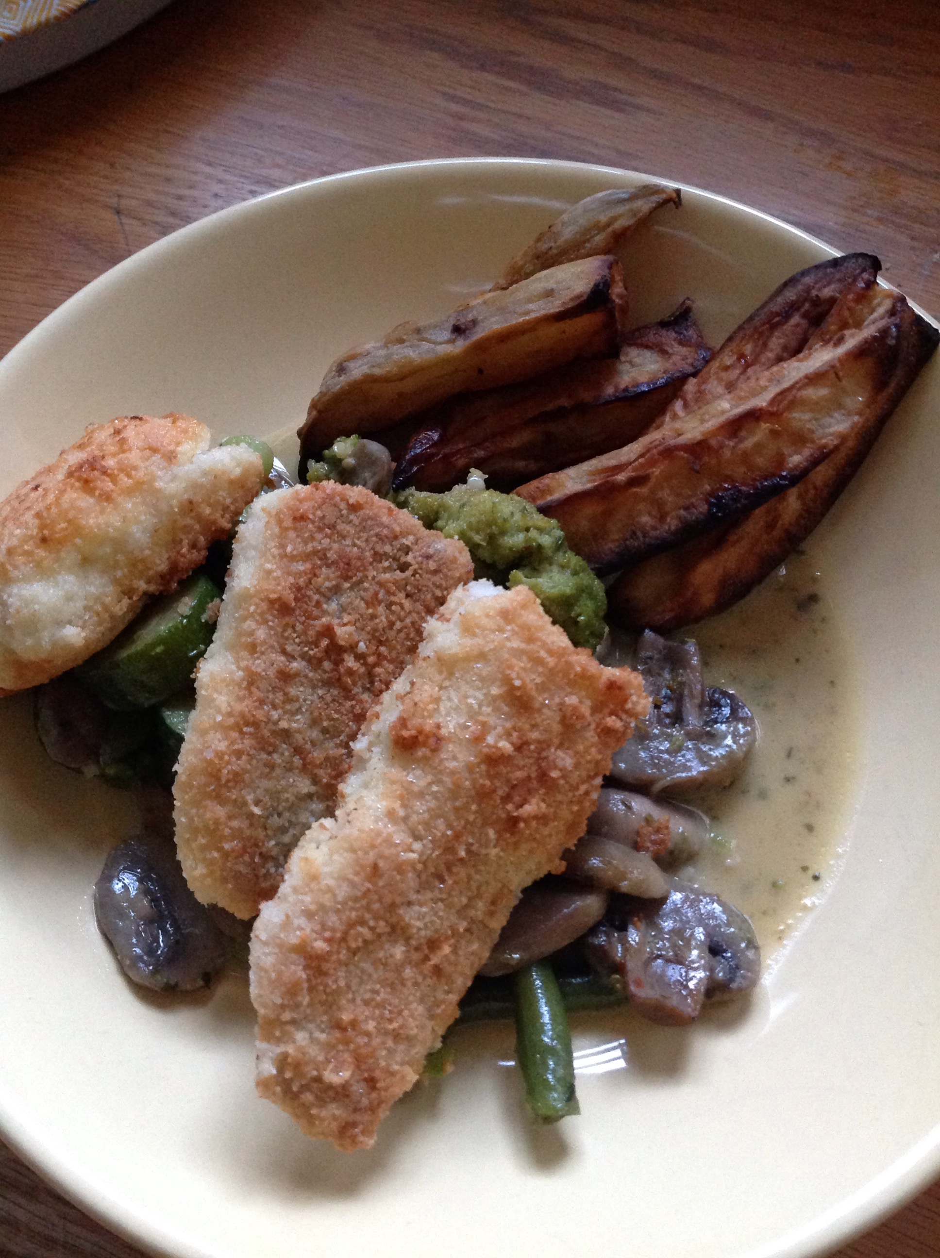 Norm had bought some lovely hake earlier that week which needed to be cooked so I cut them into pieces, dipped in egg and breaded by rolling in a mix of almond flour and coconut. I steamed mixed veggies and added a bit of coconut cream and curry. I roasted crispy sweet potato wedges in coconut oil to go with.