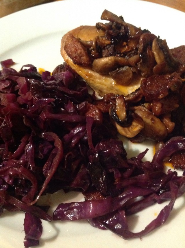 I came up with a new meal, I cooked woollies chorizo and mushrooms in a knob of butter and then removed them from the pan and browned chicken breasts in the leftover spicy oil. I put it all in the oven, but next time I won’t bother precooking the chorizo so much as it will cook enough in the oven. I will just cook it long enough to cook out the oils to brown the chicken. We just served it with red cabbage which I cooked in butter and balsamic til a good crust formed on the bottom of the cast iron pan then added a bit of boiling water to soften the cabbage and get a nice sauce by scraping the bottom.