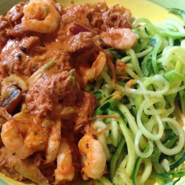 I made a sort of gumbo out of the last of the roast gammon, chorizo, mushrooms and prawns and served it with zucchini spaghetti. It looks a mess but was so tasty!