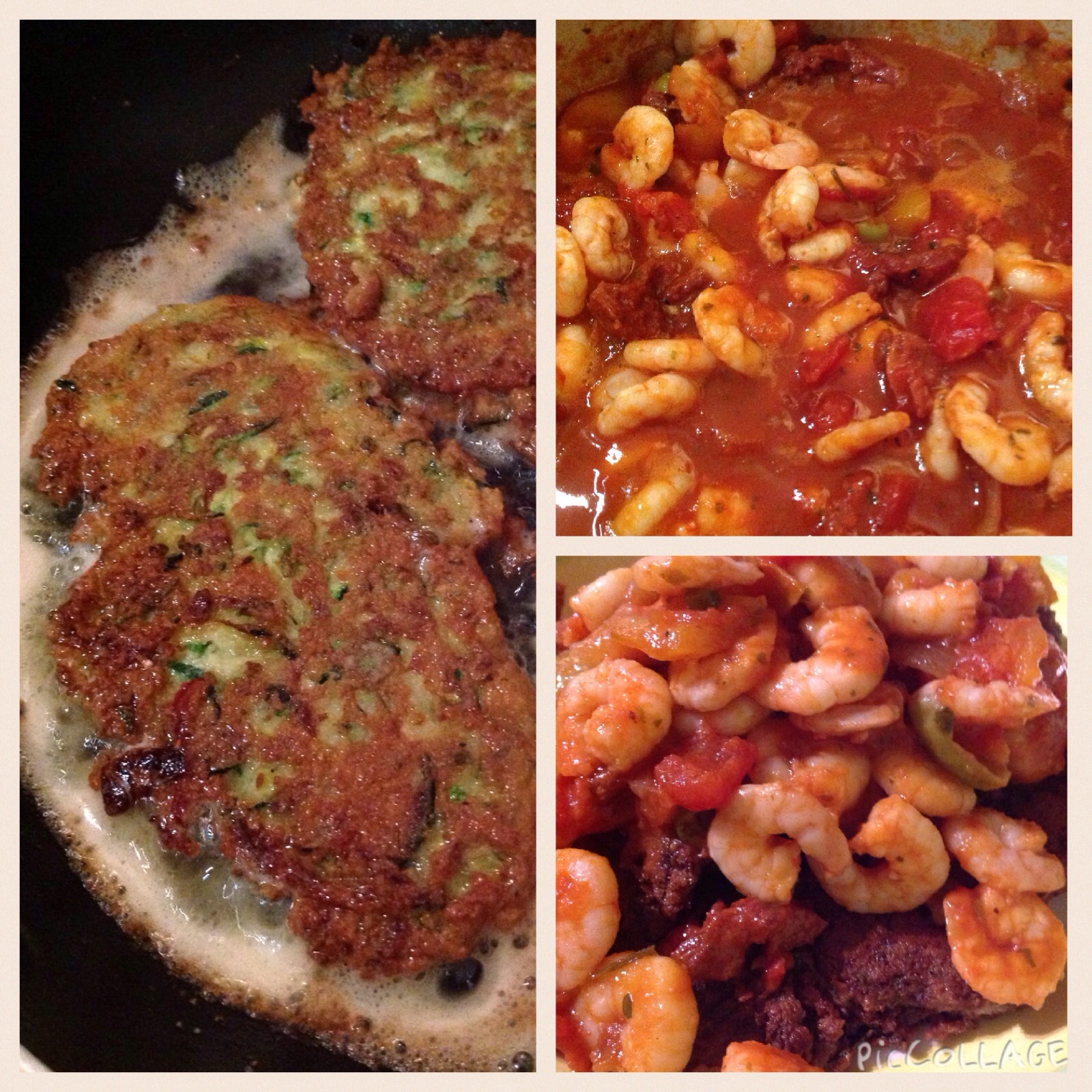 I used the remaining zucchini mixture and made more fritters. I cooked chorizo and prawns in chili and tomato and served it on the fritters.