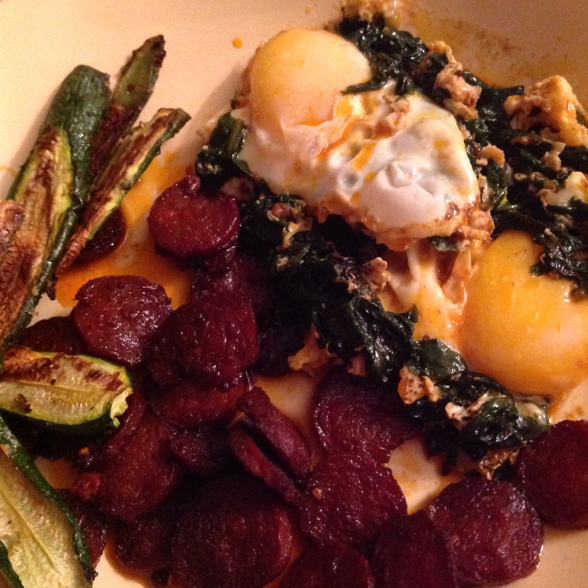 Thursday Caitlin and I made the chorizo, spinach and egg dish again. I had Parmesan out and so I grated a bit on the chorizo. Don’t do that. It made it stick badly. Oops.