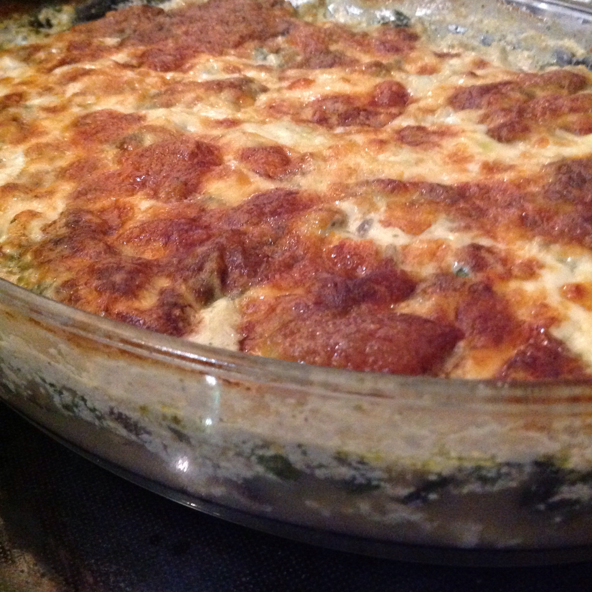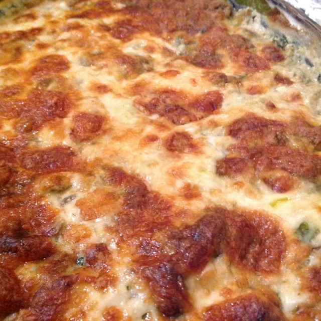 I got home late so I needed a quickly prepared dinner. I had some chicken which needed to be eaten. So I put the chicken breasts in a casserole dish, piled on a packet of baby spinach, topped that with sliced mushrooms and then poured on a mix of half a tub of marscapone mixed with chicken broth. I baked it for 45 minutes – half the time covered with foil. I sliced a block of mozzarella and topped it for an additional 15 minutes.
