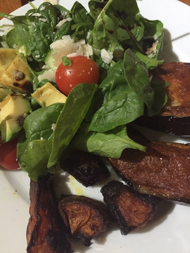 I roasted a bag of pumpkin, sliced aubergines and baked them then once soft I topped them with mozzarella and cooked a bit longer. To go with I made a big spinach salad with tomato, avocado, and topped it off with grated fresh Parmesan. Simple to prepare and healthy after a day at work.