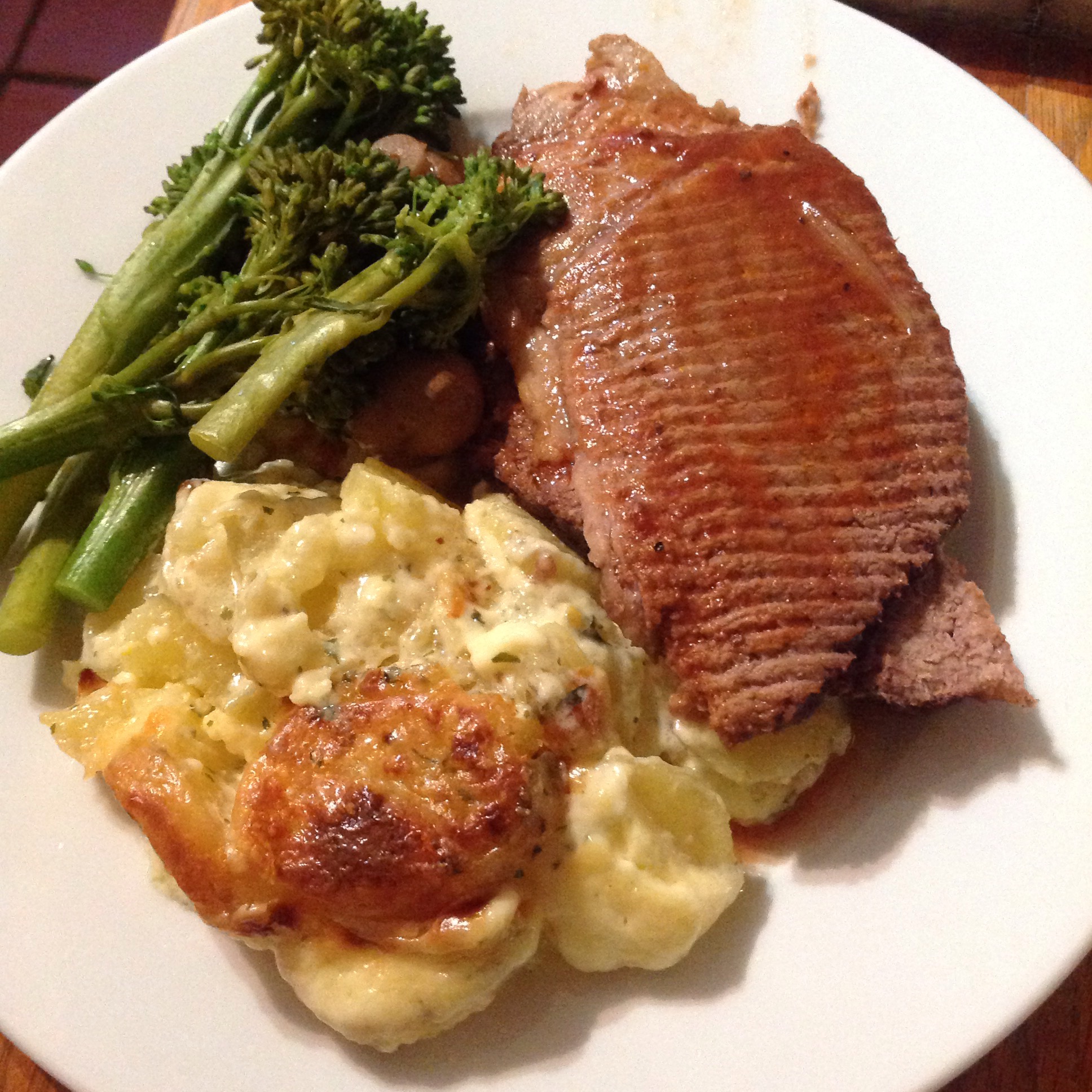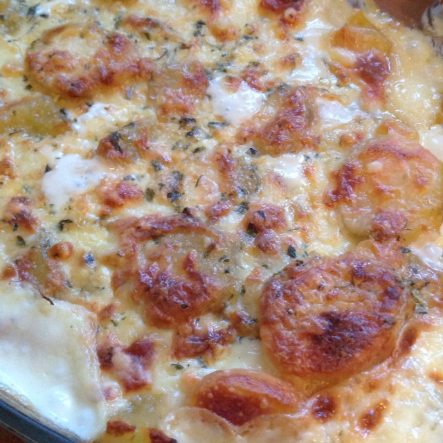 I would normally cook my pot roast in cream of mushroom soup with carrots and potatoes added in before we started Banting, so instead I parboiled sweet potatoes, scraped off the skins, sliced into medallions and lined a glass dish with them, alternating the laters of sweet potato with layers of mozzarella. I mixed cream with half of a container of marscapone and poured this over the layers of sweet potato and cheese and baked til brown and bubbly.