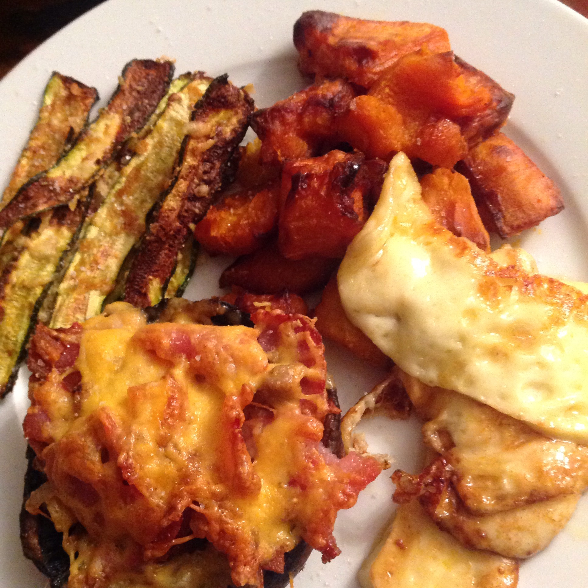 Thursday was my usual creative dinner night. AKA what’s in the fridge? Let’s eat it. This time I ended up with giant mushrooms which I fried in butter and garlic then stuffed with crispy bacon, onions, yellow pepper, garlic, Parmesan and topped with cheddar. I had a few zucchini left which I sliced, covered in fresh grated Parmesan and baked. I roasted pumpkin in coconut oil and fried some thick slabs of halloumi. It went well together luckily!