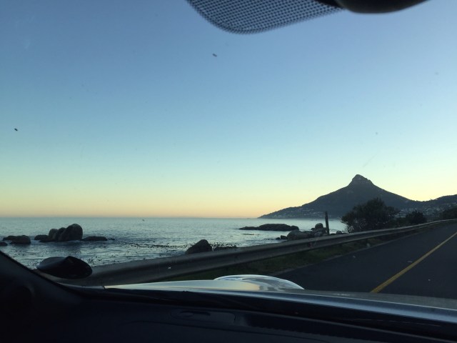 Monday was another gorgeous day. I was up too late on Sunday night and struggled to get up so Mondaymorning and ended up in the huge 7am queue of traffic into town. The sun was just up over the sea. The horizon a lovely pink. This is me parked waiting for the shuffle of cars.