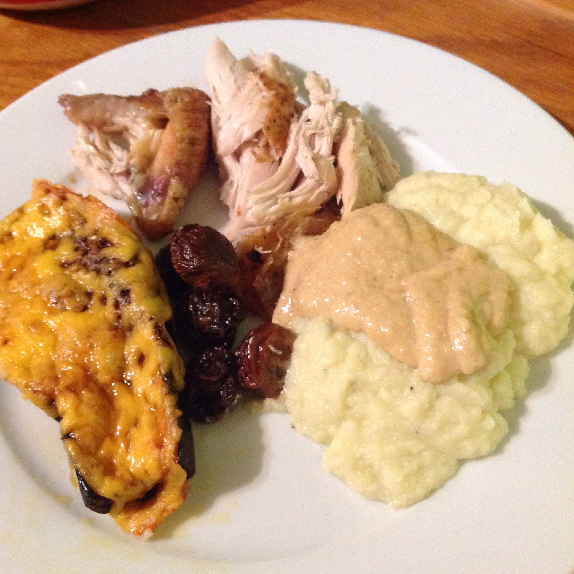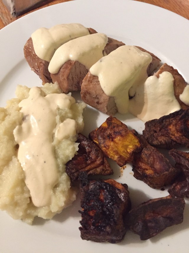 Wednesday evening I got home late and was rather knackered so I wanted something I could start cooking and leave a bit so I could relax. I pan fried some pork fillets in butter. Tossed pumpkin in olive oil and put in to roast and sat to rest for a few minutes to destress. Then I steamed the cauliflower and put in the blender and added an egg yolk and puréed it. Once I took the pork out to rest I added cream to the pan and made a sauce.