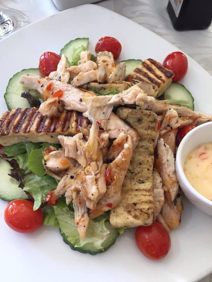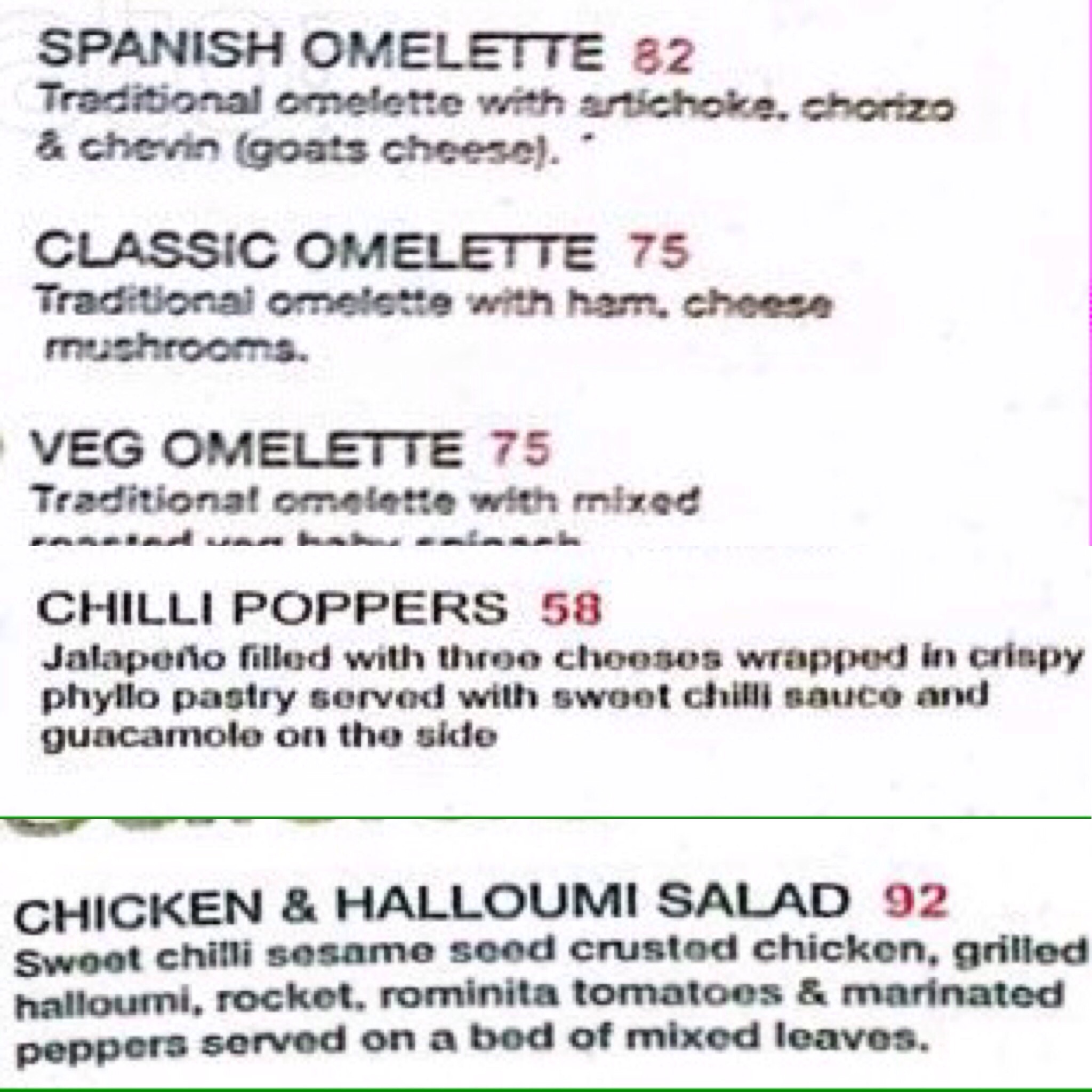 I ordered the chili poppers and the chicken and halloumi salad and Norm ordered the Spanish omelette, my own speciality!
