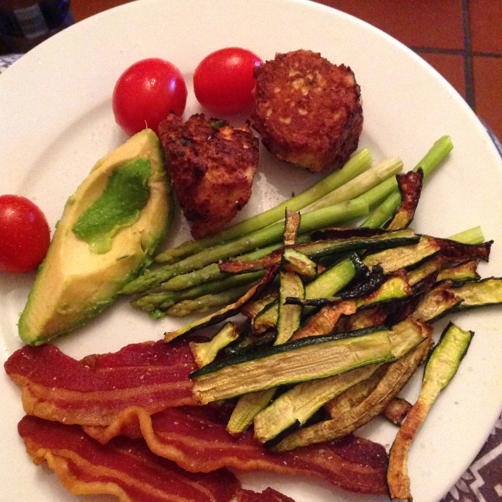Last Monday evening was quite warm so I kept dinner light. I made chicken and coriander meatballs. I added puréed onion and red pepper, 2 eggs, coconut flour, and coriander to minced chicken. It was too sticky to make nice round balls. It was like cooking a pyramid. But I eventually got them browned. I served with rosa tomatoes, avocado, crispy bacon, steamed asparagus and roasted crispy zucchini. All carb free 100%.