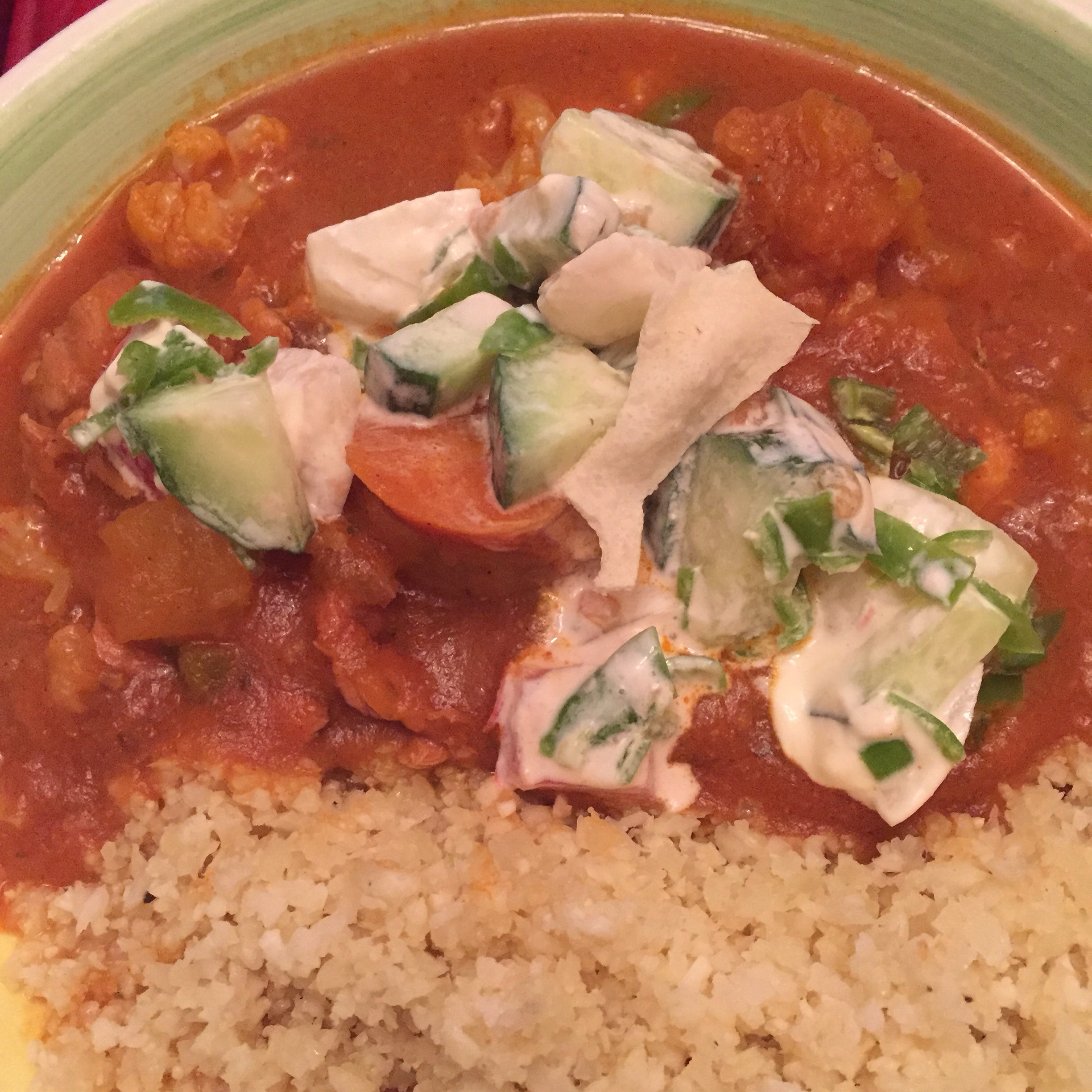 To go with it I made normal basmati rice for the girls and cauliflower rice for us low carb peeps. I just chopped up onion, cucumber and tomato and mixed in a bit of fromage frais. I had all manner of veg in the curry and in my bowl I added lots of green chilis as well.