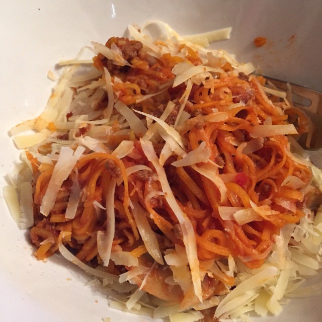 That night we had the third of my midweek holiday prepared meals, bolognaise sauce. Norm picked up Butternut ‘noodles’ and we had those with my bolognaise sauce and fresh grated Parmesan.