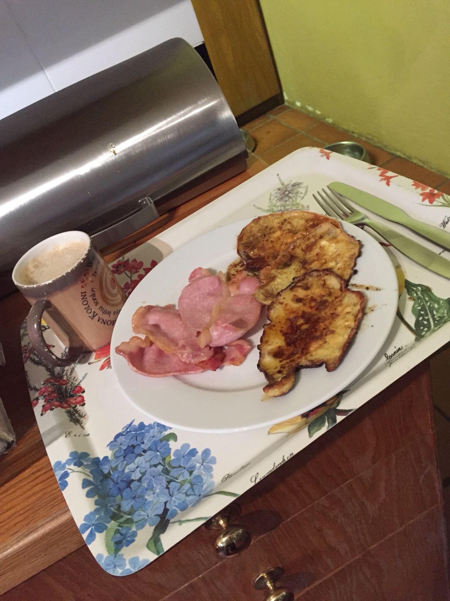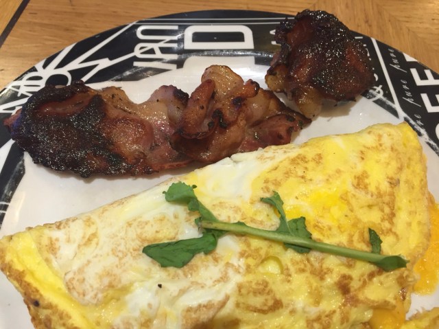 They brought a gorgeous hot latte to me and I ordered a cheese omelette with crispy bacon on the side.