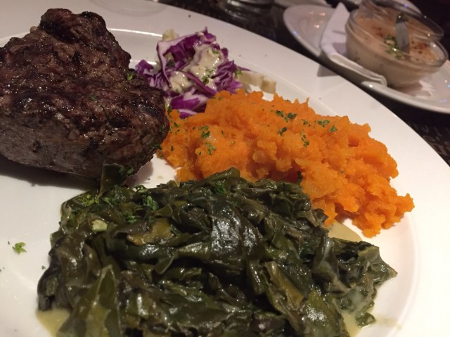 The tradititional SA fare of butternut and spinach was perfectly cooked. I liked the little bit of raw shredded cabbage in a sour vinegary sauce. It was excellent. The steak was the end cut of the fillet and therefore was not as tender as it could have been, but it was cooked exactly as I asked, pink throughout but not bloody. Perfection.