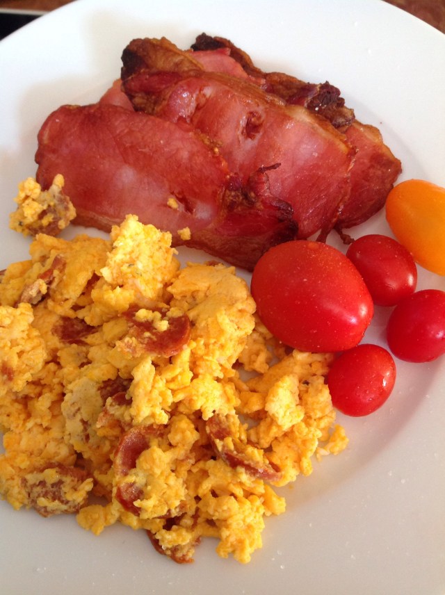 I stopped off at La Cuccina in Hout Bay as it was on my way home and I was starving. It was now about 1 pm. I ordered the Sweetcorn Fritters Breakfast at R68. It consists of poached Eggs, plum tomatoes and crispy bacon. It isn’t Banting but hopefully less carbs than a normal Eggs Benedict.