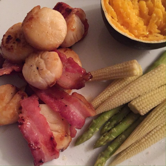 One night I made scallops wrapped in bacon and fried in butter, steamed baby corn and asparagus and gem squash mashed with butter.