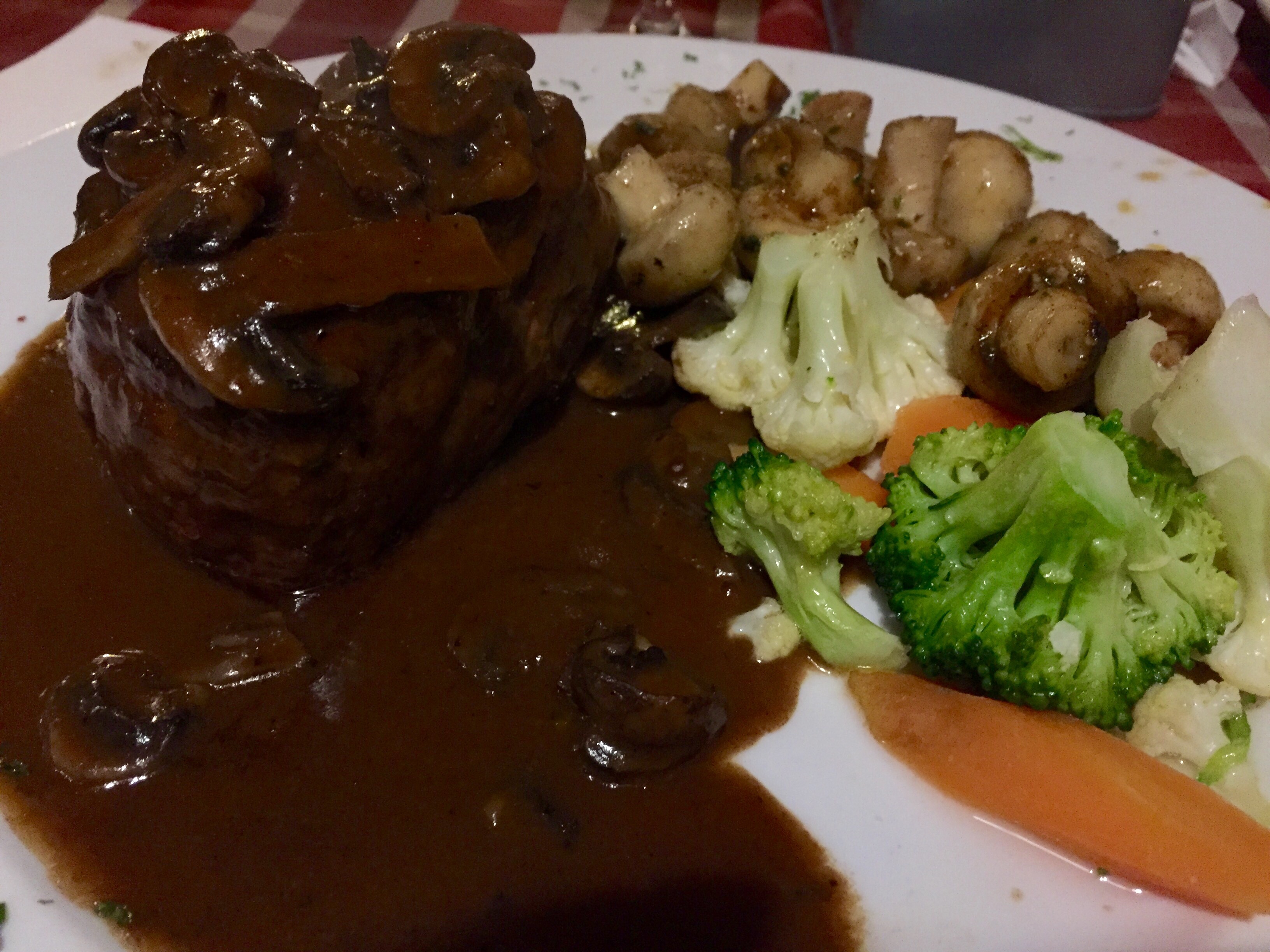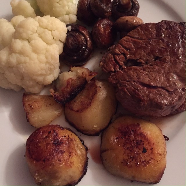 He made fillet steaks with steamed cauliflower, sweet potato fried in butter, and mushrooms fried in butter.