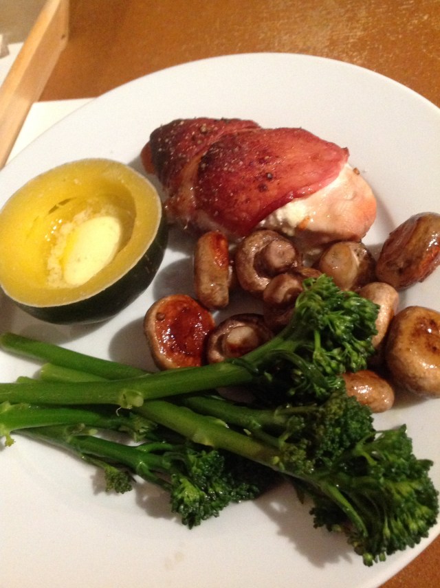 After Vanessa left I made dinner, chicken breasts stuffed with goats cheese and wrapped in bacon.