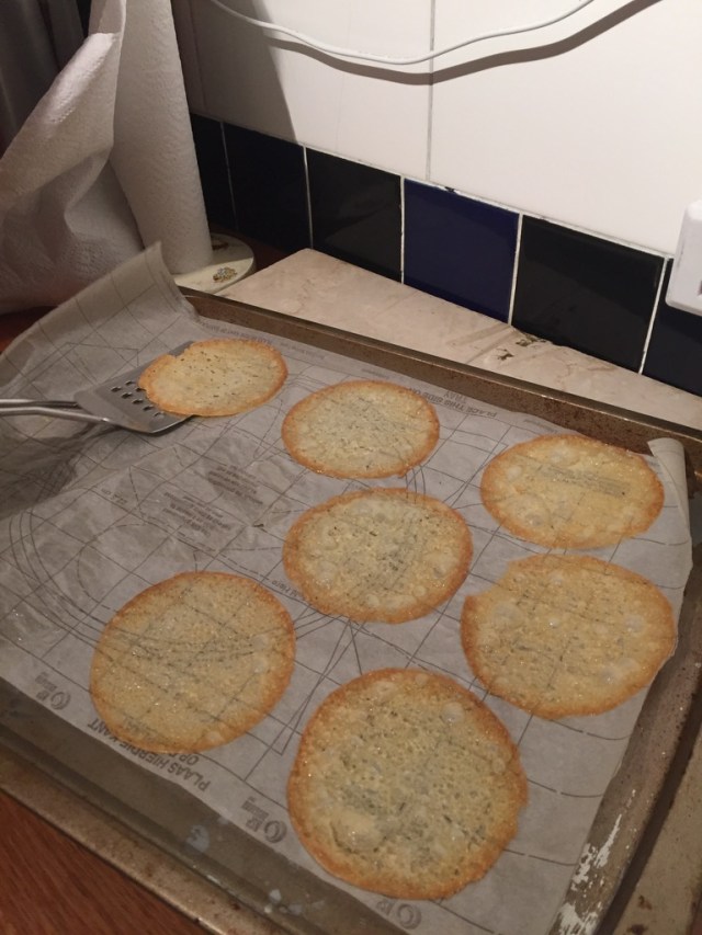 We made guacamole and chopped tomato, lettuce and more coriander. I made provolone cheese ‘shells’.