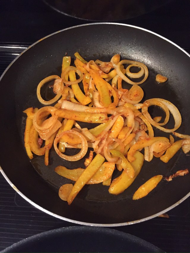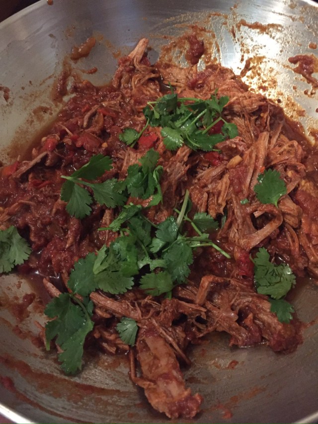 Tonight I shredded the left over meat from last night’s beef roast and added chili powder, paprika, cumin, chilli, chopped coriander and heated through.