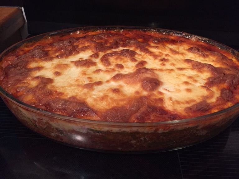 While all of this deliciousness was being made I also made a lasagna sauce for the following night. Luckily Caitlin came home and helped. I followed the Real Meal Revolution recipe (more or less) and fried chopped streaky bacon in a cast iron pan until brown, removed from the pan and fried a chopped onion and a gigantic red pepper in the bacon fat, then fried some mince and once done added a generous squidge of tomato paste and stirred it through lifting that lovely brown sediment at the bottom of the pan, then added passata and a tin of tomato. I left it to simmer for a few hours.