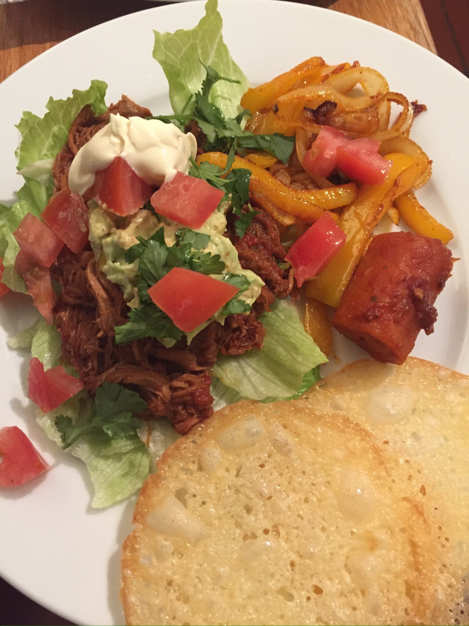 Tonight I shredded the left over meat from last night’s beef roast and added chili powder, paprika, cumin, chilli, chopped coriander and heated through.