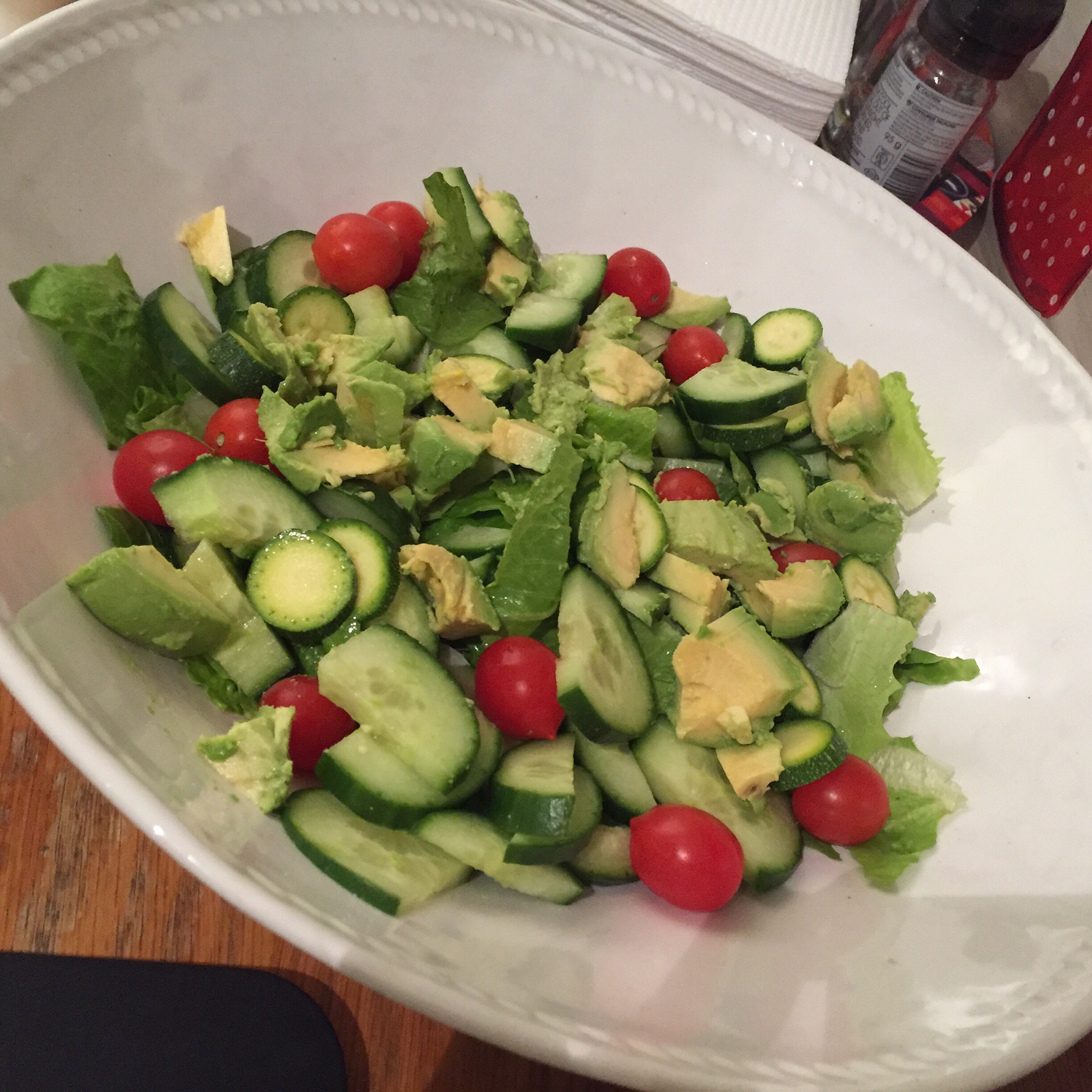 I just made a simple salad with gem lettuce, avocado, cucumber, rosa tomatoes and some raw zucchini slices to go with it.