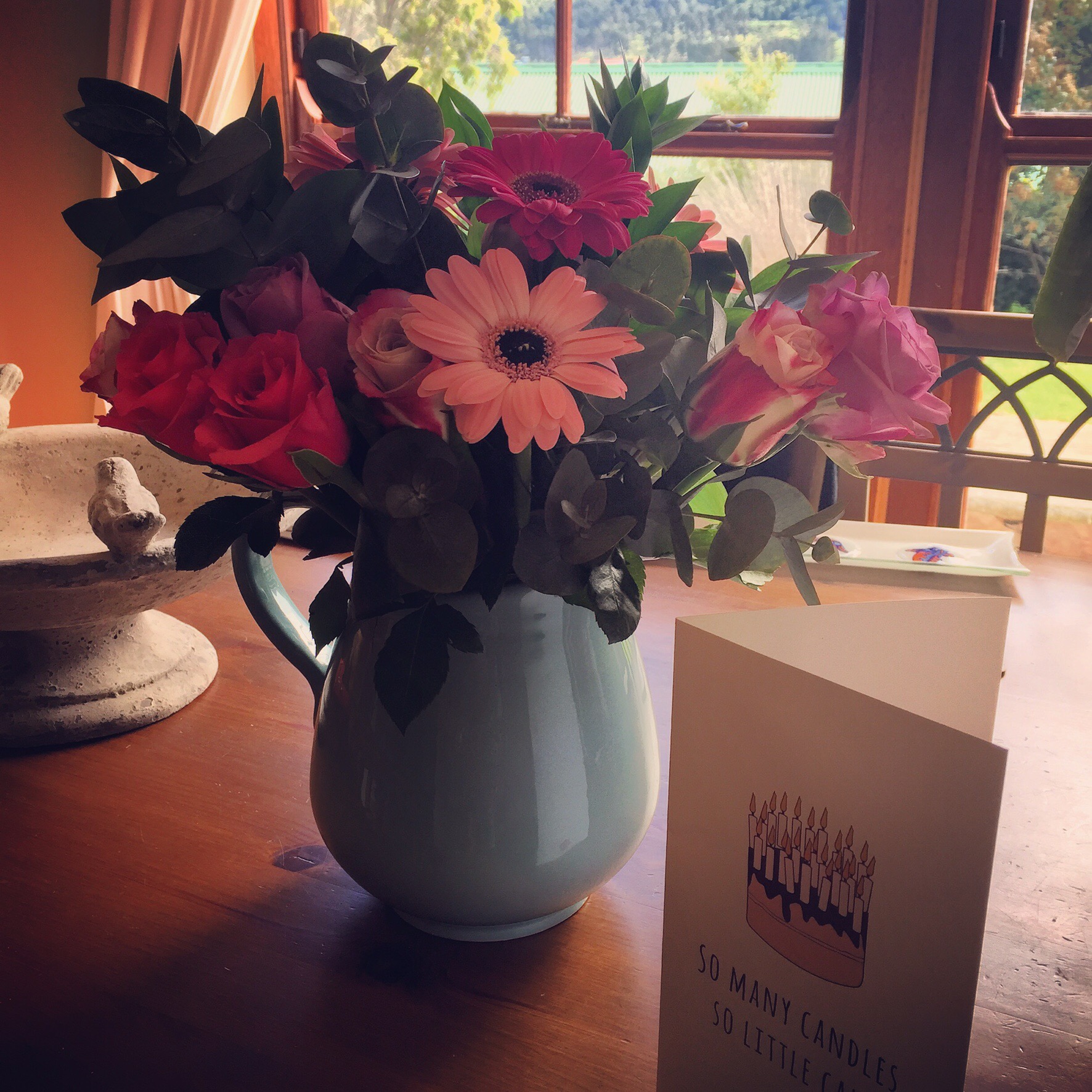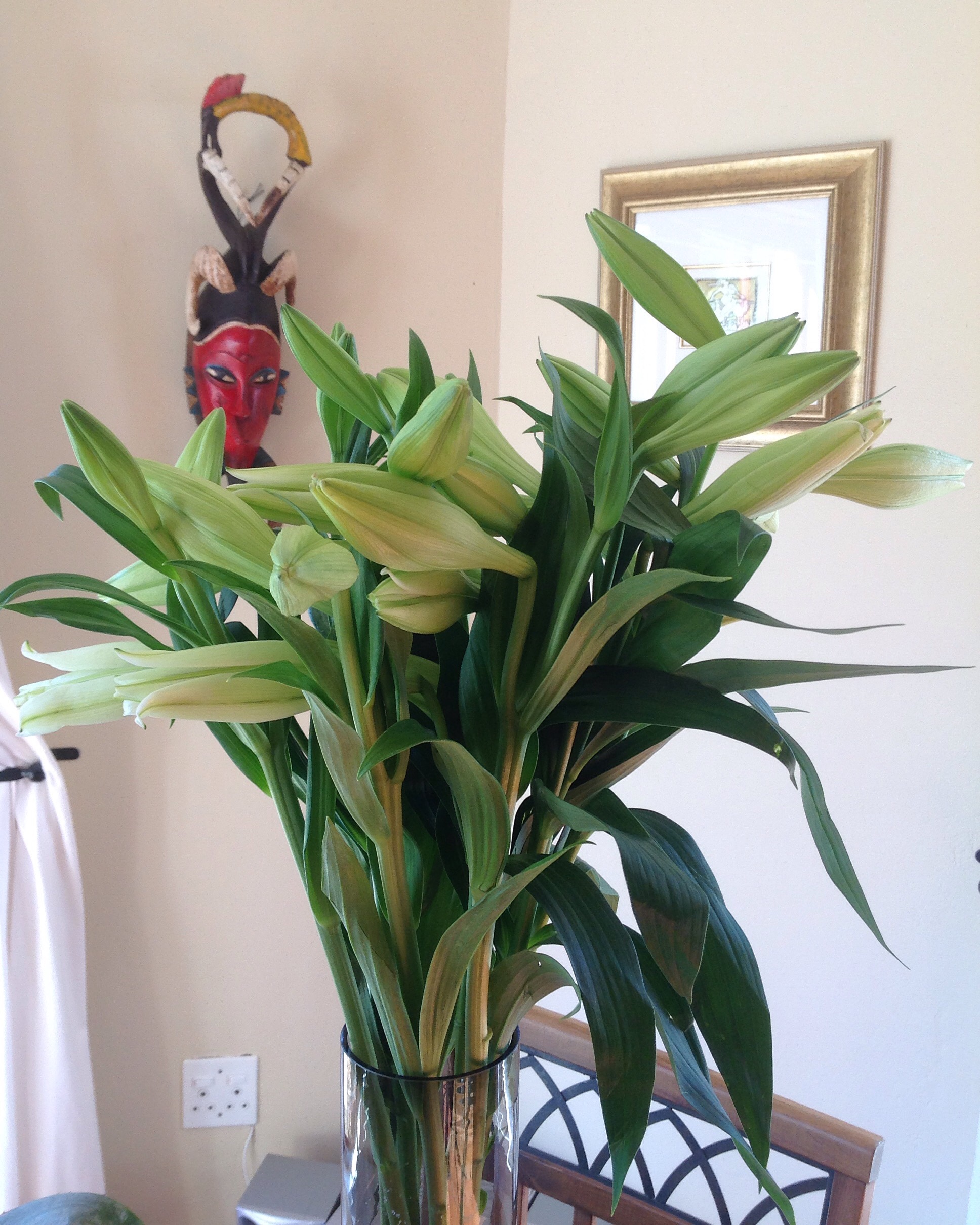 We headed home and watched movies and some of us napped. Later Wes, Caitlin’s fella, came round. He brought me a huge beautiful bunch of lilies.