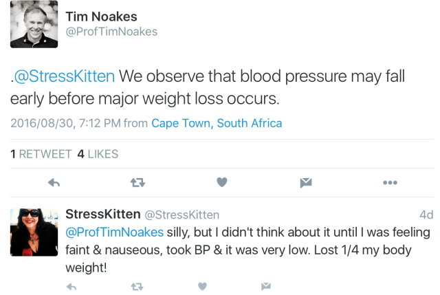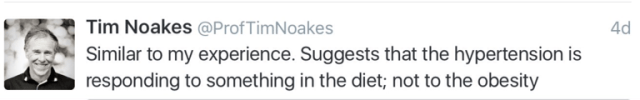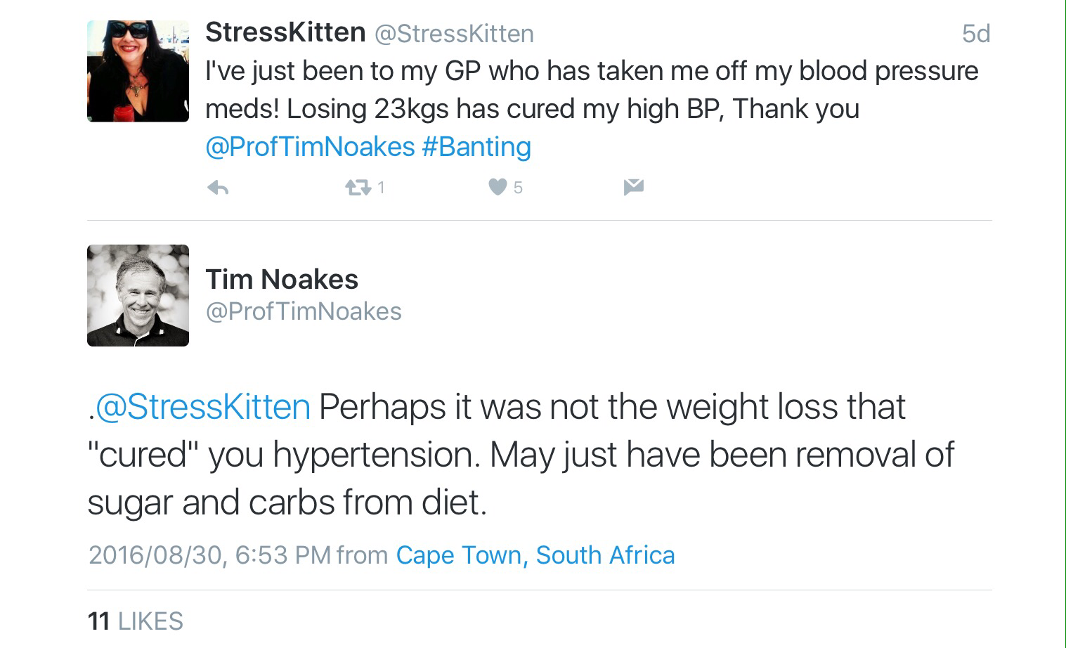 I sent a tweet to Professor Tim Noakes who promotes the Real Meal Revolution. We had a Twitter convo where he explains that the dietary change rather than the weight loss is what resolved my blood pressure issue.