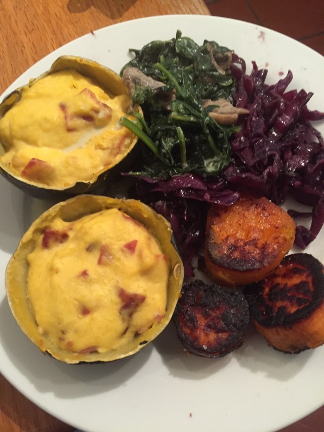 With it we made fondant sweet potatoes, spinach and mushrooms fried in butter and red cabbage which I parboiled then fried in butter and balsamic. It was so delicious and all low carb.