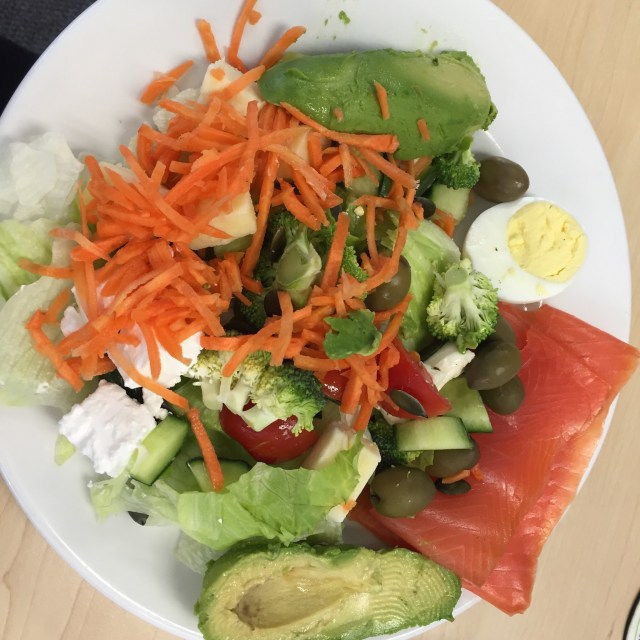 As a result of having no leftovers, the next day I decided to take some smoked salmon to work for lunch so I walked to Food Lovers Market and visited the salad bar and made up a simple salad but they had no ripe avos so I bought a tiny perfect avo at the corner shop for only R3 and I took it all back to the office kitchen to construct it. It went so nicely together. It also meant a nice midday stroll out in the gorgeous sunshine.
