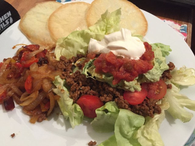 I made spicy mince with cumin, garlic, chili, chili powder, paprika and a bit of stock and cooked peppers and onions in butter. I served it salad style with butter lettuce, rosa tomatoes, avocado, sour cream, salsa and cilantro. I made taco ‘shells’ from baking thinly sliced smoked provolone until bubbly.