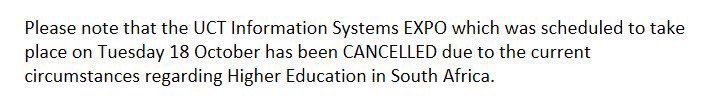 I received an email from the University of Cape Town advising that the Information Systems Expo was cancelled due to the unrest.