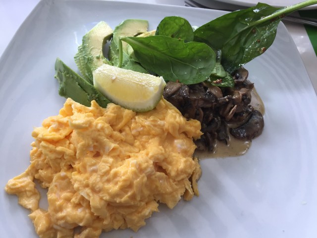We ordered coffees, scrambled eggs, mushrooms, bacon and avocado.