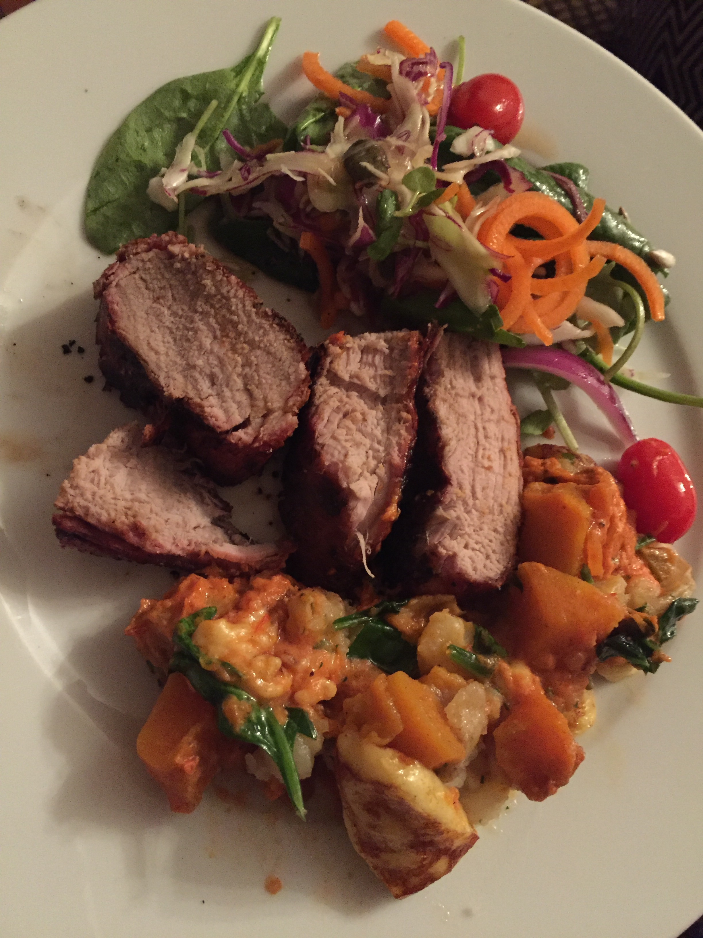 Since I got home so late on Thursday Norm cooked for us again. He cooked pork fillet on the gas grill and bought salads. Halloumi and butternut and a crunchy salad from Woolies. We don’t have anywhere to prepare anything in our non-existent kitchen. Food has to be mostly ready to eat. The halloumi and butternut salad just needed a minute in the microwave.