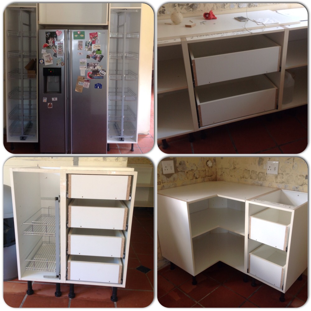 The baskets and drawers were in place as were the electrical sockets. We have 2 large food larders by the fridge for groceries. I have sooo many electrical outlets!