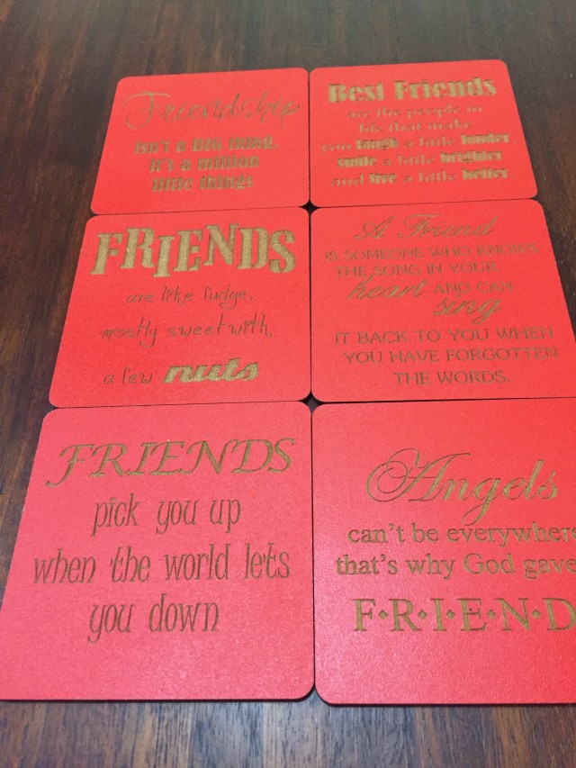 Retha surprised me with the cutest coasters in my favourite colour and they all say sweet little phrases. The funny thing is that Norm and I had been lamenting the dreadful state of our coasters at home just that day and then I arrive to a random surprise gift of coasters! My psychic connection to Retha never fails to surprise me.