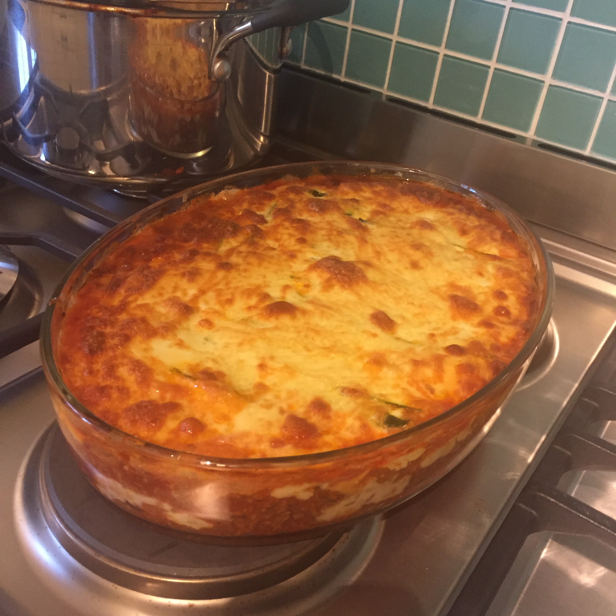 I had made sauce for lasagna on Wednesday so I just had to slice the zucchini and the mozzarella for layering. It was delicious.