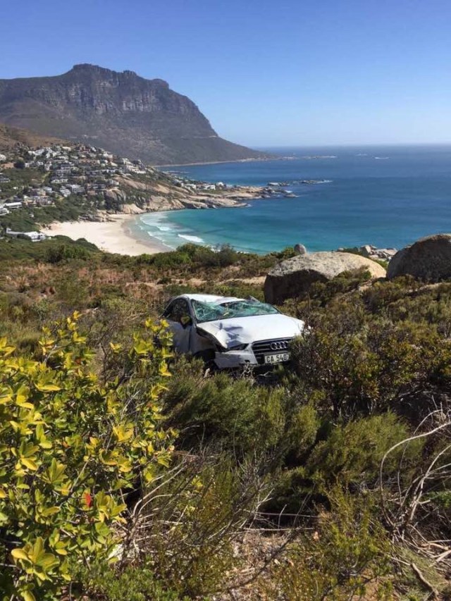 The traffic when I went home on Monday was busy and at one point there were cars pulled off the road with dozens of people hanging over the railings and staring at the sea. I had assumed it was whales or dolphins but it was a car they were staring at and photographing. A guy in an Audi was seen just before the crash driving like a lunatic up Suikerbossie Hill and as a result he shot right off the side of the cliff.