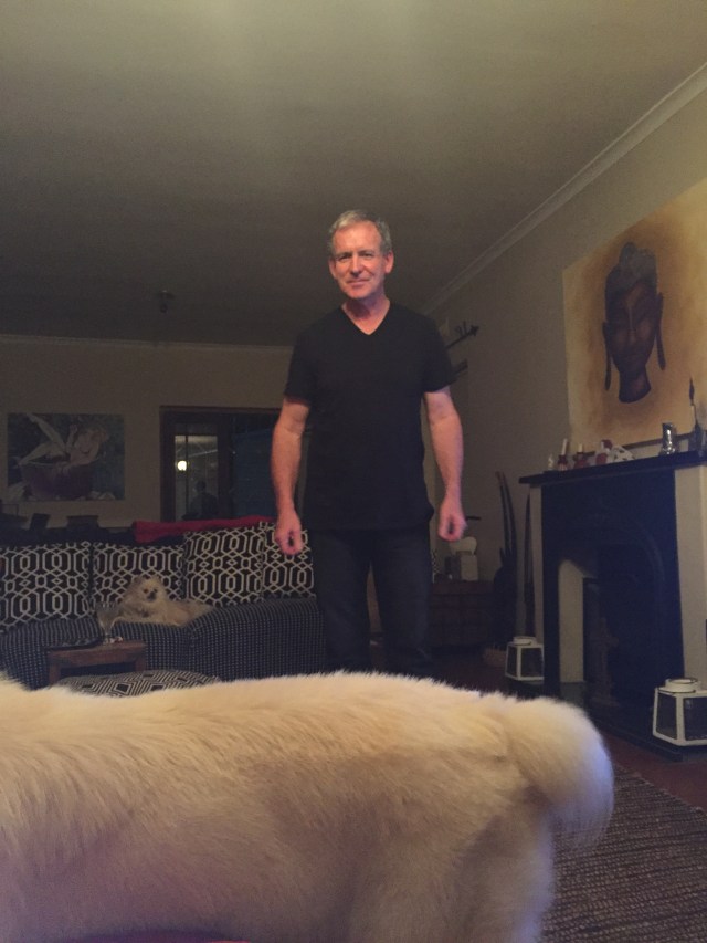 It has been a week of volatility and chaos in South Africa. In my last blog I mentioned the protest that we in South Africa were calling ‘Black Monday’. Norm and I were both participating by wearing all black and tweeting our support of the cause. I tried about a dozen times to get a decent pic of Norm in his protest gear that evening but his dog pack would not eff off and leave him alone so we have a Navajo rump shot included for free. As always Panda has his eyes locked on his love, that dog adores Norman.