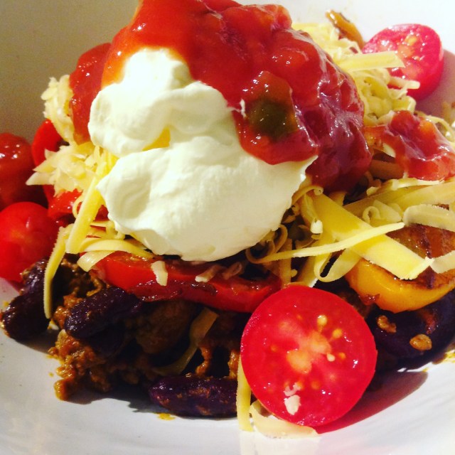 I was still left without a salad for a base, and I decided to chuck into the meat the single can of kidney beans I found in the cupboard and rebrand it as chilli con carne with cheese crackers. I fried onions and peppers in a separate pan and prepared the toppings and it all turned out just fine. It was actually rather delicious if not banting compliant as I used beans.
