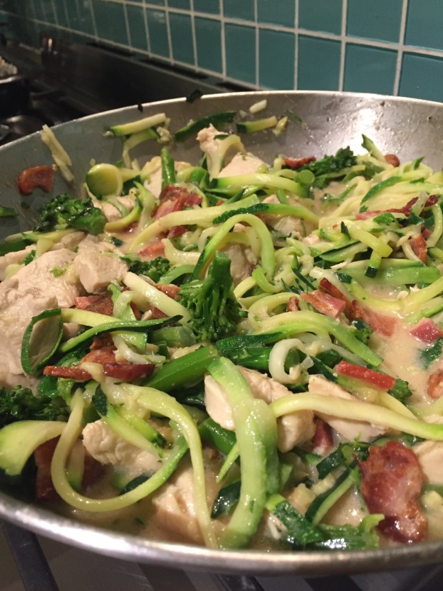 That night all of the family contributed to making dinner. Norm shopped the day before and bought zucchini noodles and we decided to do a pseudo pasta with chicken and bacon in a creamy sauce to go with them. Norm chopped the chicken breasts then he had to nip out to the shops again as we discovered that the zucchini noodles bought the day before had gone slimy and icky already. While he was out I grilled the bacon and seasoned the chicken and Caitlin came home and took over and she put it all together and added the broccoli and coconut cream.
