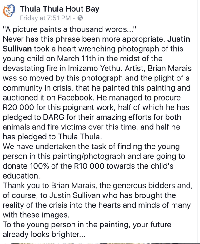 A nice bit of local news that I saw this week from the Thula Thula Charity was that one of the haunting photographs that was taken during the recent Hout Bay fire disaster was made into a painting and auctioned off and the proceeds will be put towards helping both the local animal shelter as well as the actual child in the photo.
