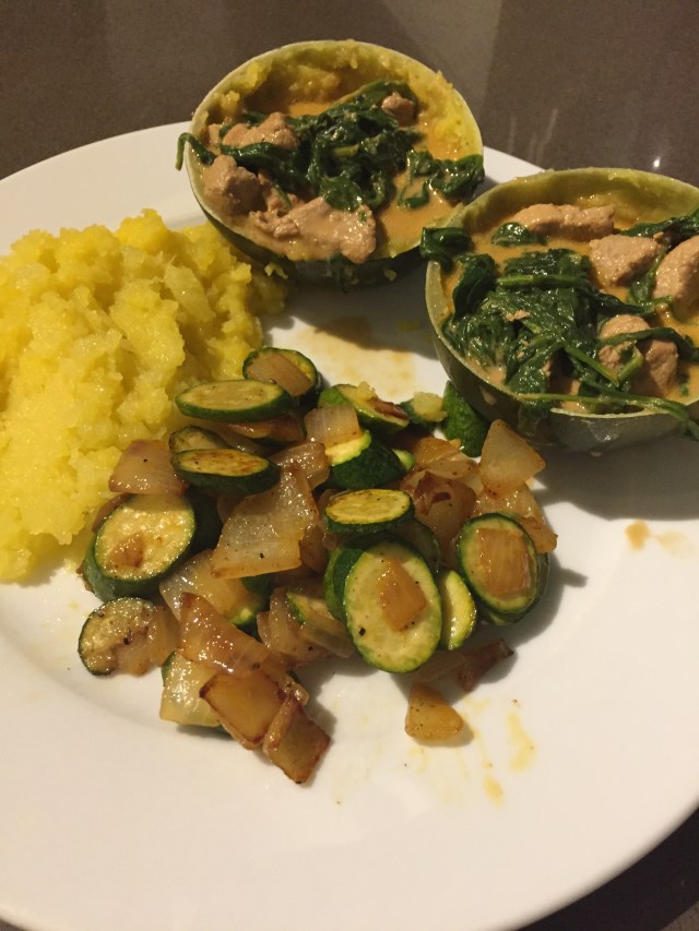 I made a lovely dinner of gem squash stuffed with pork fillet and spinach in a mascarpone sauce on Tuesday evening. I started with steaming the gem squash as I am rubbish at timing how long these things take.