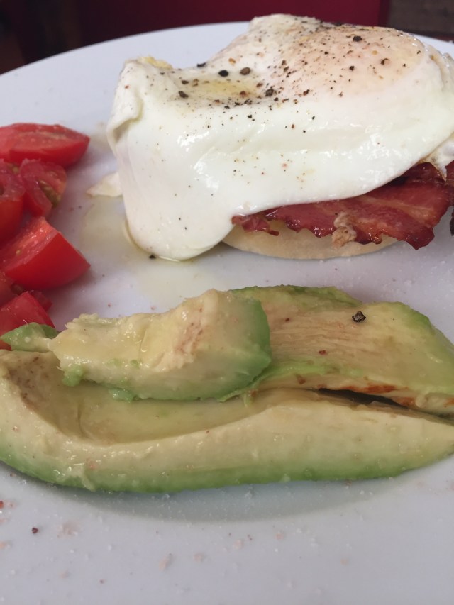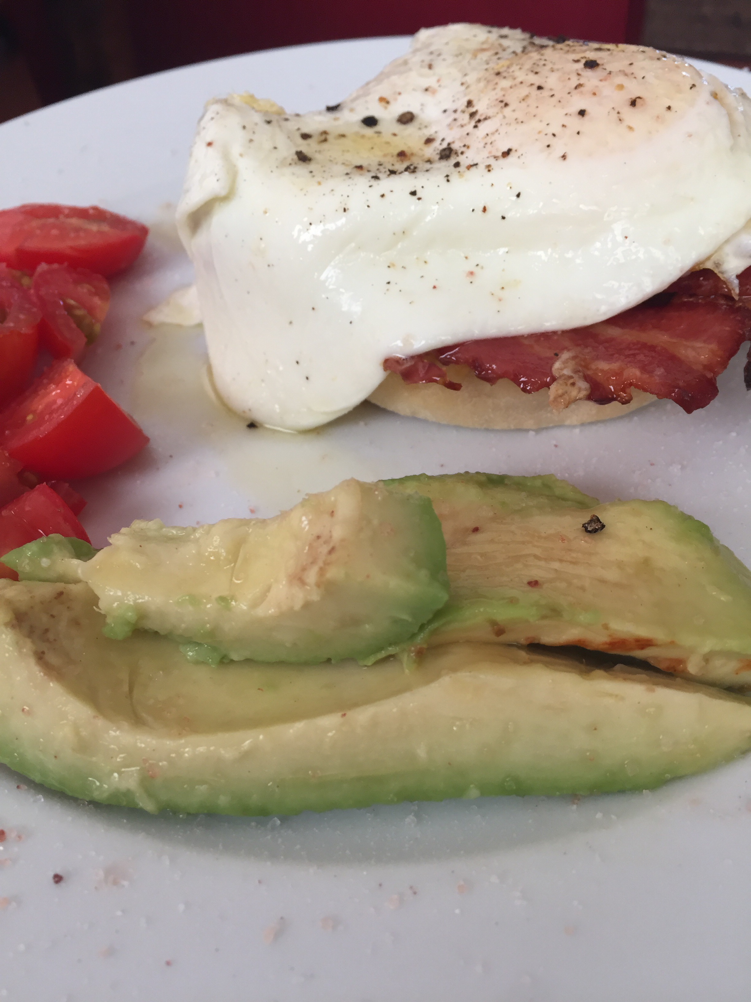 Lily and I made a very late brekkie for the gang after Norm came back from dropping Panda. We did a sort of open faced Egg McMuffin for Lily and Josh but Cordelia and I shared an English muffin and Norm was virtuous and did not have one at all. We toasted them first, then topped with cheese and baked so they were nice and crispy. We made crispy bacon, eggs with runny centers and served with sharp rosa tomatoes and ripe creamy avocado.