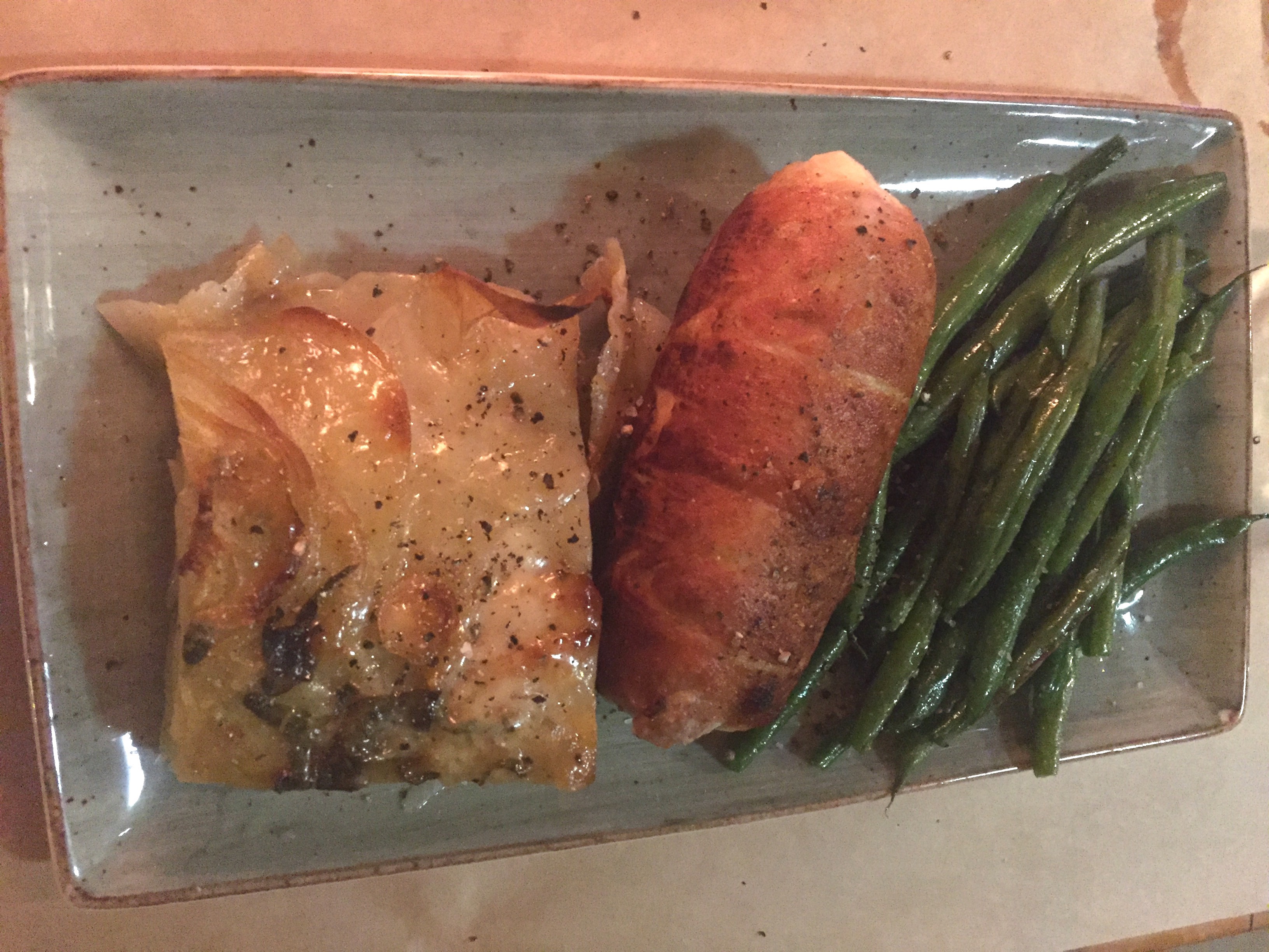 Norm ordered the Chicken dish that was on special. Free range chicken breast stuffed with Italian garlic sausage, parmesan & peas, served with boulangere potatoes and green beans 125.