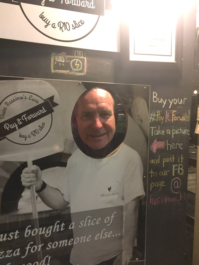 Massimo’s have a brilliant concept called ‘Pay it Forward‘. Massimo’s clients can buy one or more R10 ‘virtual’ slices of pizza and for every 6 slices sold Massimo’s will deliver one pizza to a local charity. We added 2 pieces to our bill. #shareMassimosLove #payitforward