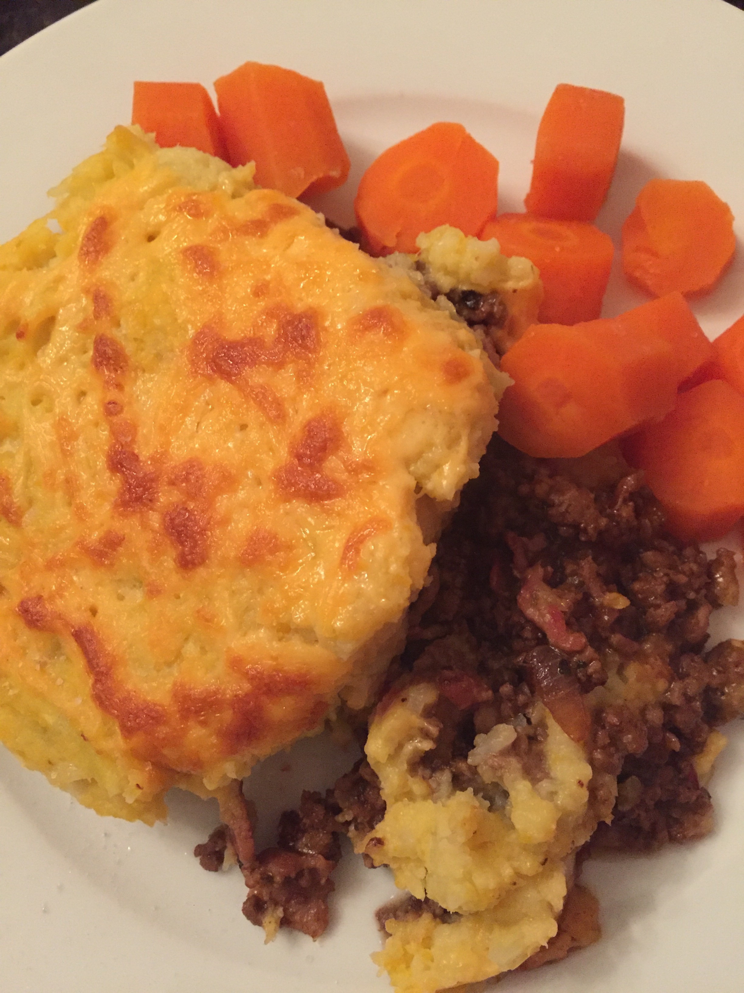 Last Friday after work I cooked dinner for myself, Norm and Caitlin. Norm had bought some mince and cauliflower so I decided to make a banting Cottage Pie. As we had a tiny bit of butternut left over in the fridge I steamed that as well as a big bag of cauliflower and blended them both to make the topping. When Norm pureed it we also added an egg yolk to help bind it all. For the mince I fried it in one pan, fried an onion, a big yellow pepper and a pack of chopped bacon in another and once both were browned I mixed together, added a big splodge of tomato paste, some Worcestershire sauce and dark soy and a half a cup of beef stock and let it simmer. We popped it all into a dish and topped it with cheddar cheese and baked it.