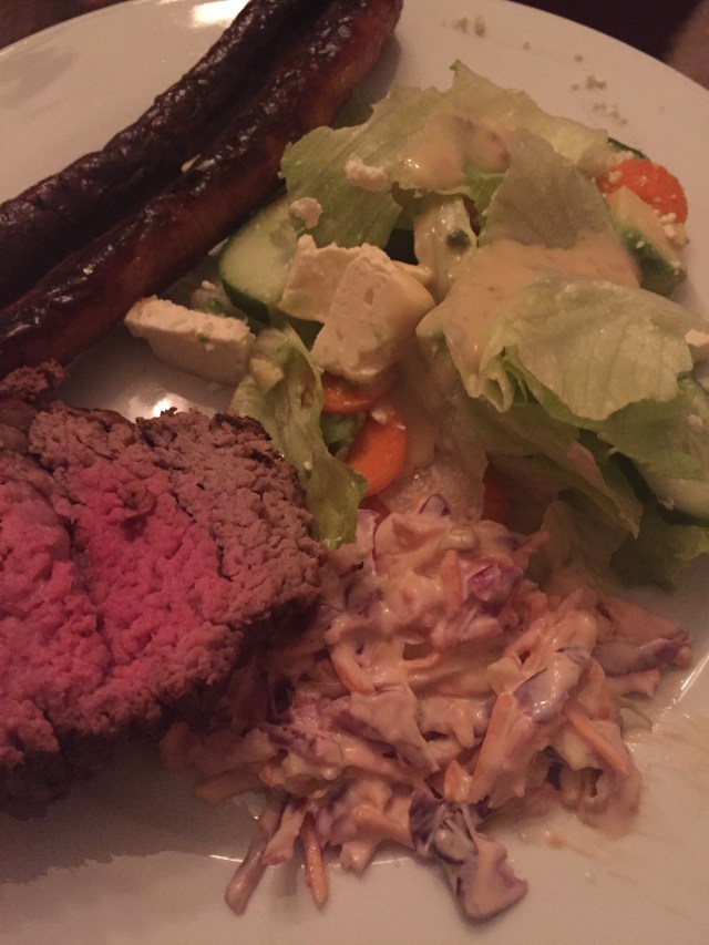 It was dark by the time Norm started the braai and as a result the sausages got a bit burnt but the fillet he cooked was lovely. We just made a big salad and served coleslaw to go with it.