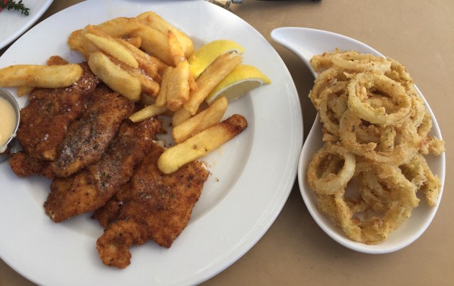 As it was a weekend I decided that carb controls be damned and I ordered their chicken schnitzel with cheese sauce, chips and onion rings. The Schnitzel comes with a choice of one side dish for R105 (about $8 USD). The cheese sauce is an extra R19 as were the onion rings (at R25).