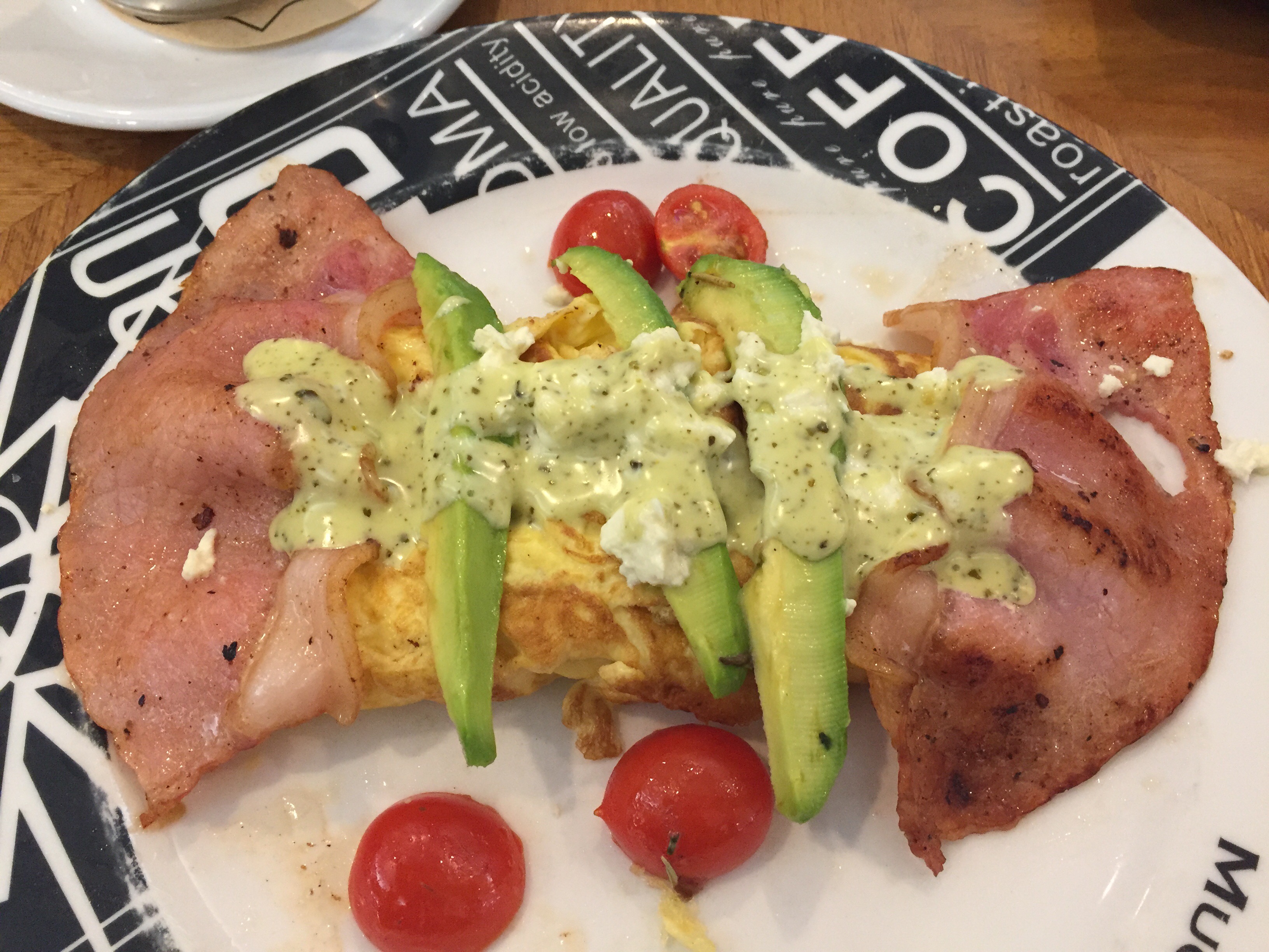 We both went for their ‘Simple California Omelette’ which is described as a deconstructed 3-egg omelette filled with cheddar, mozzarella & fresh basil. Loosely topped with fresh avocado, back bacon & Danish-style feta, drizzled with a basil pesto mayo & served with pan-fried cherry tomatoes. It is R77.90.